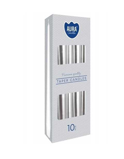 Zestaw zawiera 10 urokliwych świec stołowych Aura w formie stożków, których wyjątkowy design i elegancki charakter dodadzą niepowtarzalnego uroku każdemu pomieszczeniu. Każda z podanych świec bezzapachowych ma imponującą wysokość wynoszącą około 24,5 cm, a jej średnica to 2,3 cm, co nadaje im proporcje, które przyciągają uwagę. Te niezwykłe świece stołowe nadają się doskonale na wiele okazji, podkreślając ich dekoracyjny charakter. Od eleganckich przyjęć świątecznych, przez romantyczne kolacje we dwoje, po uroczystości rodzinne - te świece sprawią, że każda chwila stanie się jeszcze bardziej wyjątkowa. Srebrny metaliczny kolor, w jakim prezentują się świece, jest kluczowy dla ich efektownego wyglądu. Ten odcień dodaje im nie tylko blasku, ale również głębi i elegancji.